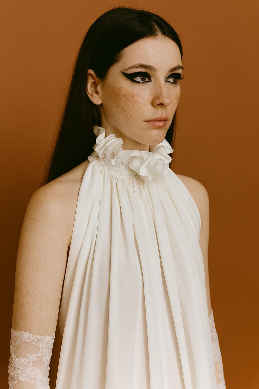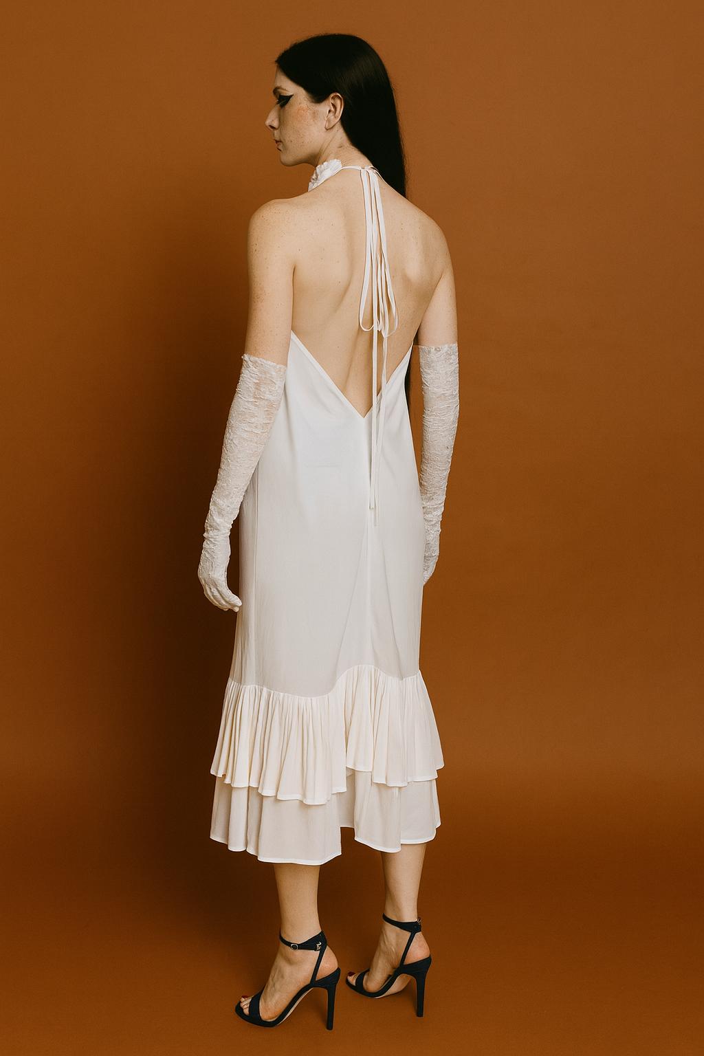 Elegantní vzdušné šaty s jemným volánem. Šaty mají odhalená ramena a záda. Zavazují se za krkem, čímž vytváří zřasené zdobení na předním díle. Díky svému střihu jsou velikostně přizpůsobitelné řadě postav. Ready-to-wear