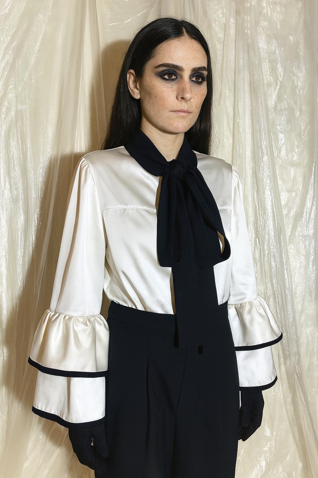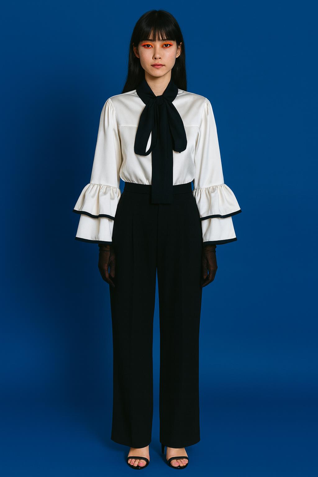 Blejzr z kolekce Line 25 je opatřen vázačkou a výraznými volány na konci rukávů. Kraje jsou kontrastně olemovány. Blejzr je plně podšitý a má ramenními vycpávkami. Volný rovný střih umožňuje pohodlné nošení. *Pre-order