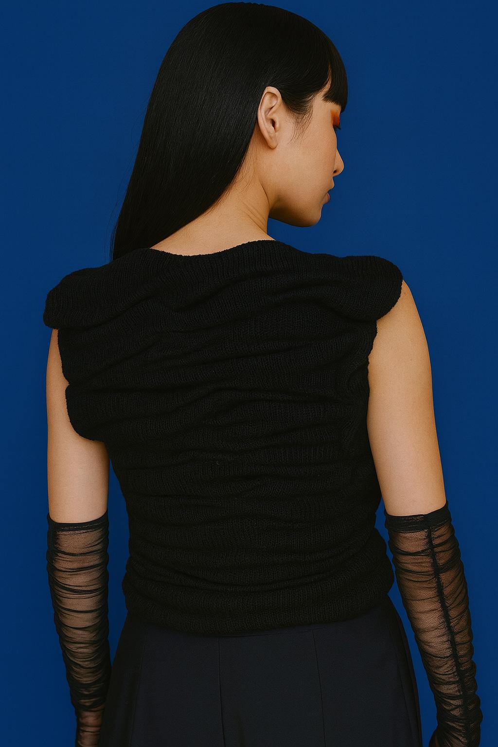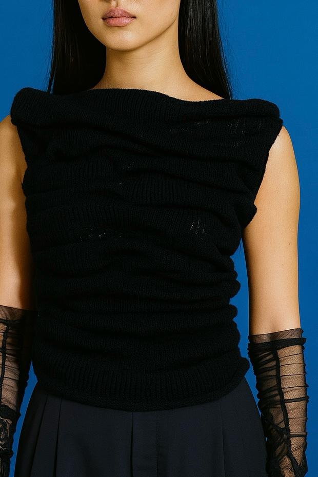Pletený top bez rukávů z kolekce Eiga. Top je opatřen vymodelovaným vlněním na předním i zadním díle. Ready-to-wear
