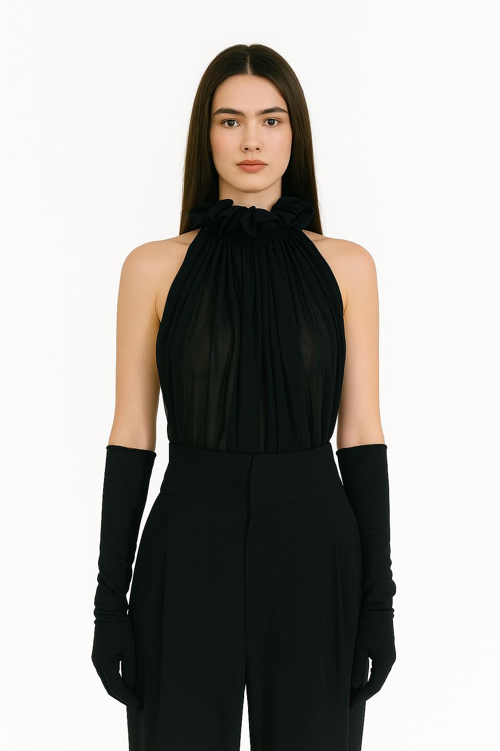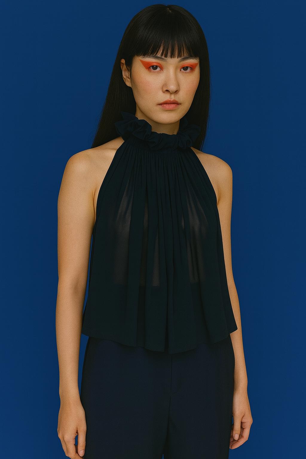 Krátká řasená halenka ze 100% hedvábí. Halenka je bez rukávů a je stažená pruženkou u krku, kde se sbíhá do jemného zdobení. Ready-to-wear
