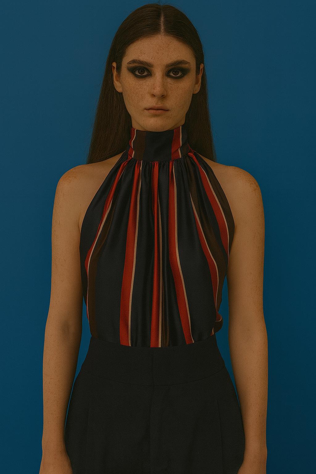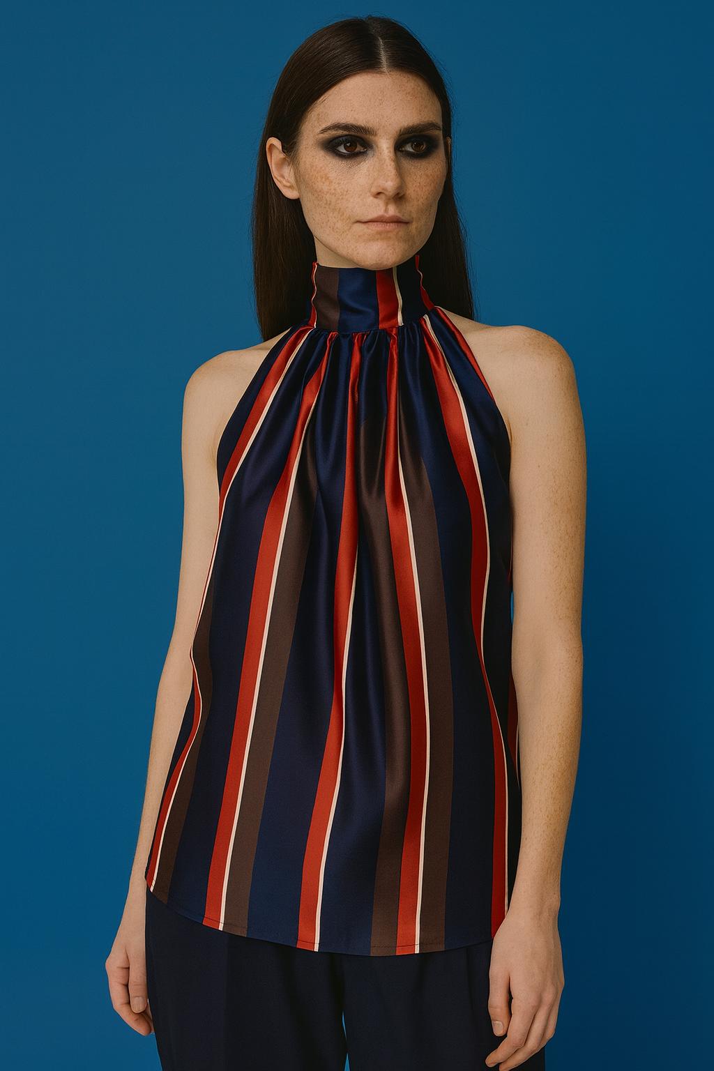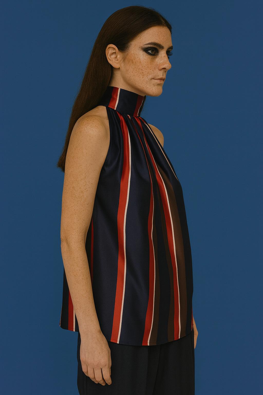 Řasená halenka klasické délky. Halenka je bez rukávů a má vysoký stojáček, kde se materiál sbíhá do zřaseného zdobení. Ready-to-wear