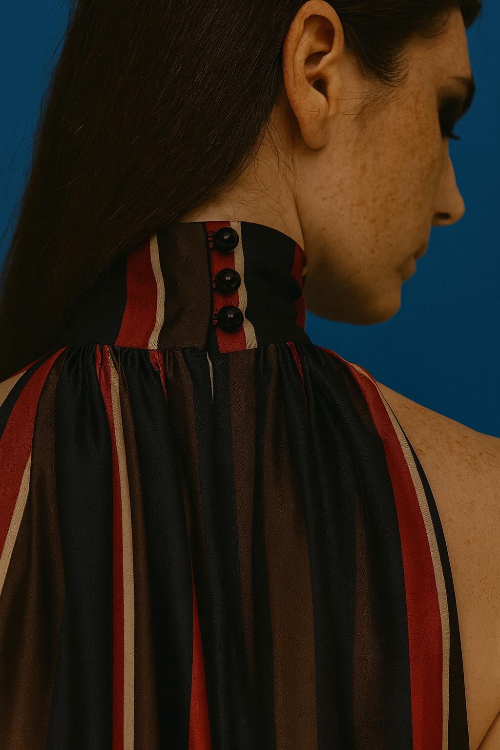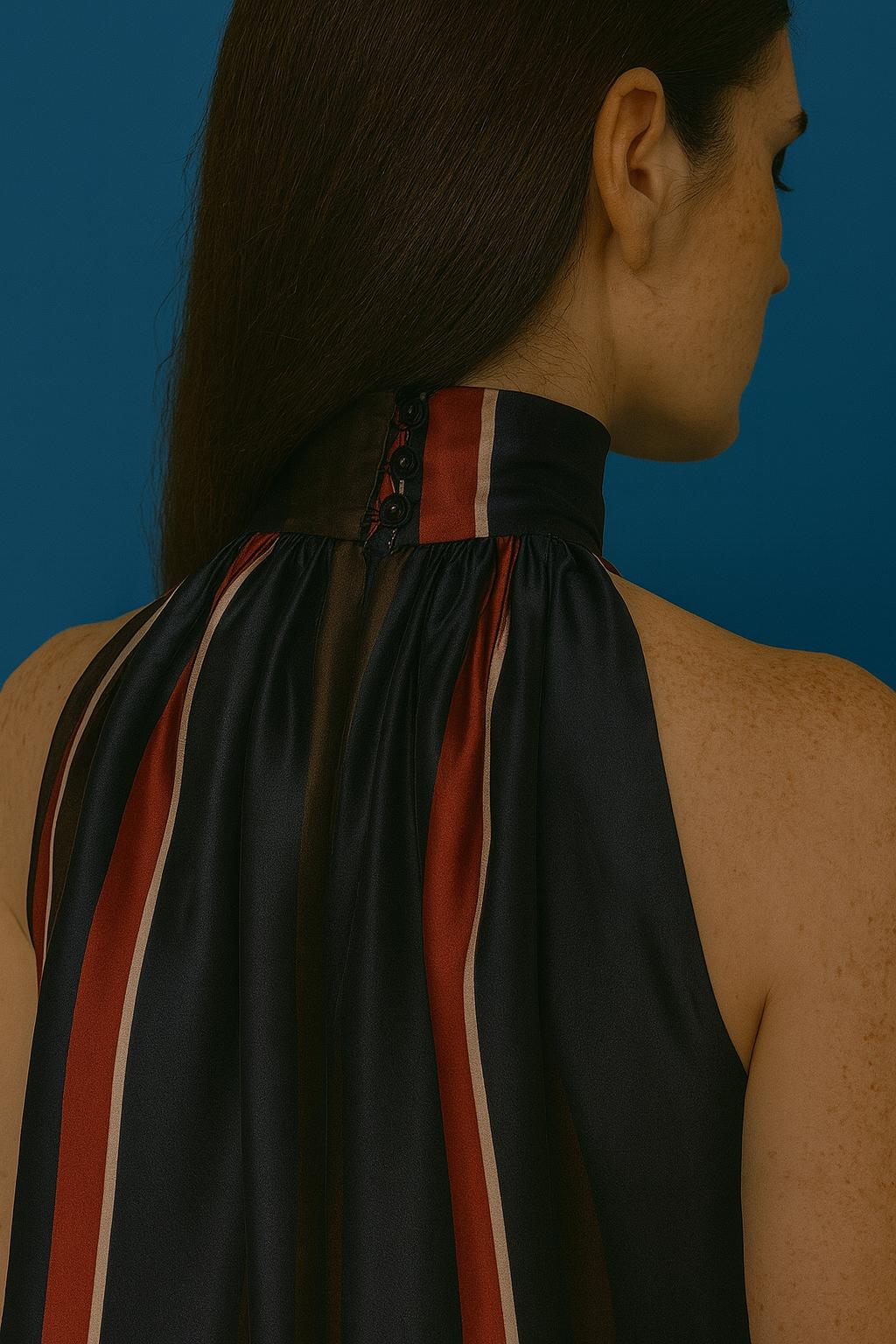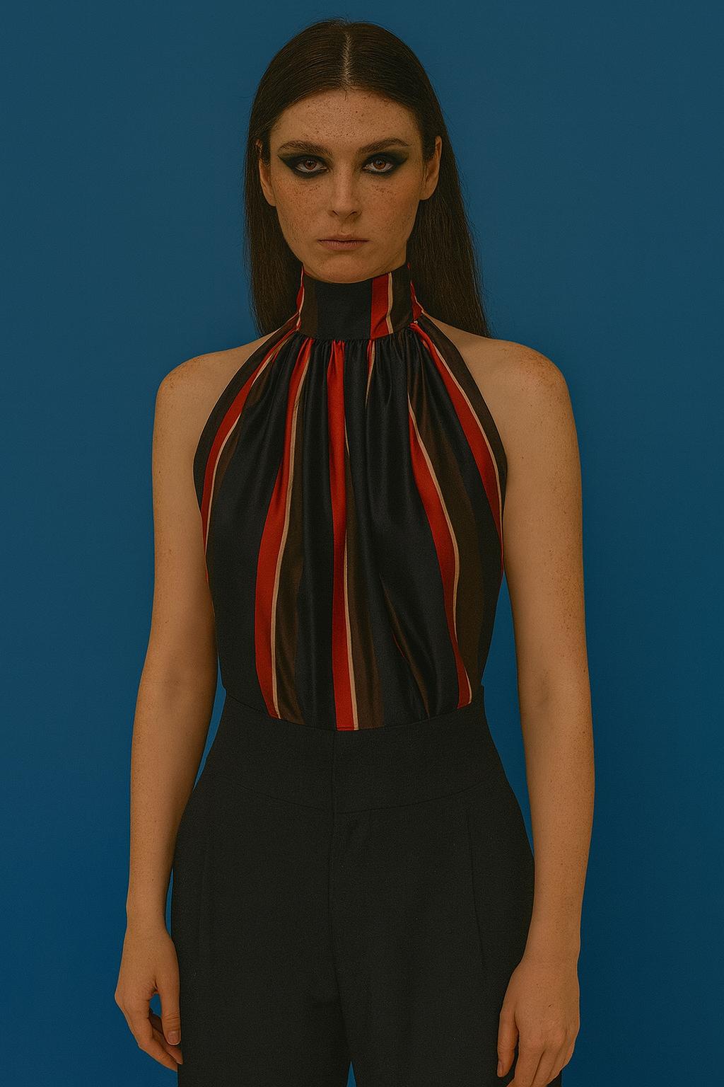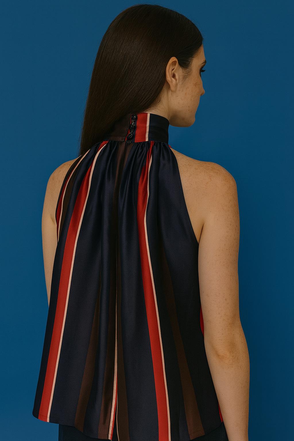 Řasená halenka klasické délky. Halenka je bez rukávů a má vysoký stojáček, kde se materiál sbíhá do zřaseného zdobení. Ready-to-wear
