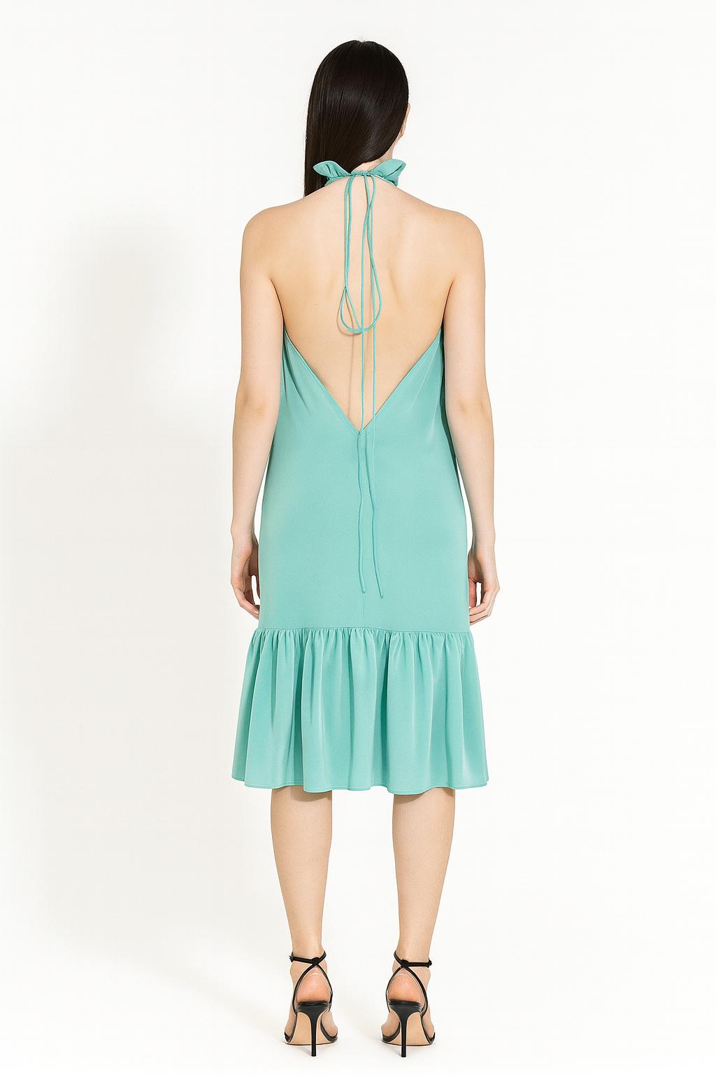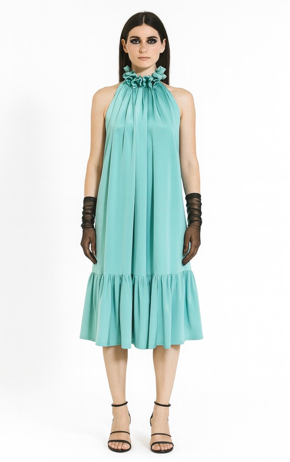 Elegantní vzdušné šaty s jemným volánem. Šaty mají odhalená ramena a záda. Zavazují se za krkem, čímž vytváří zřasené zdobení na předním díle. Díky svému střihu jsou velikostně přizpůsobitelné řadě postav. Ready-to-wear