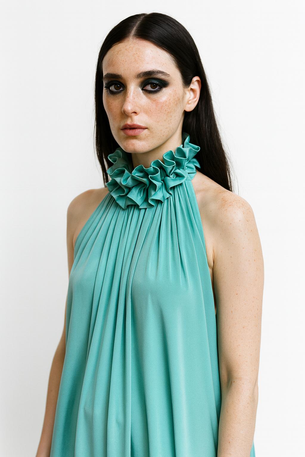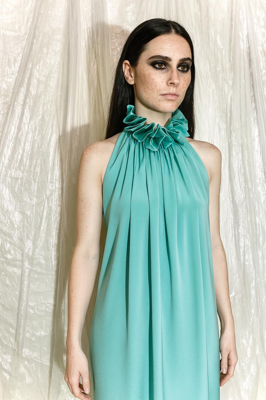 Elegantní vzdušné šaty s délkou ke kotníkům. Šaty mají odhalená ramena a záda. Zavazují se za krkem, čímž vytváří zřasené zdobení na předním díle. Díky svému střihu jsou velikostně přizpůsobitelné řadě postav. Ready-to-wear