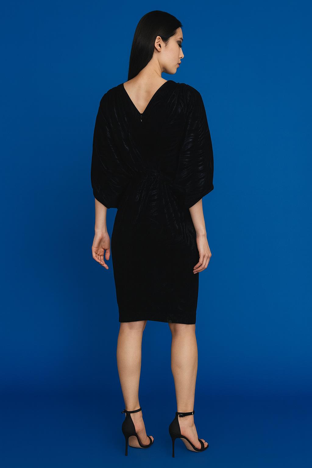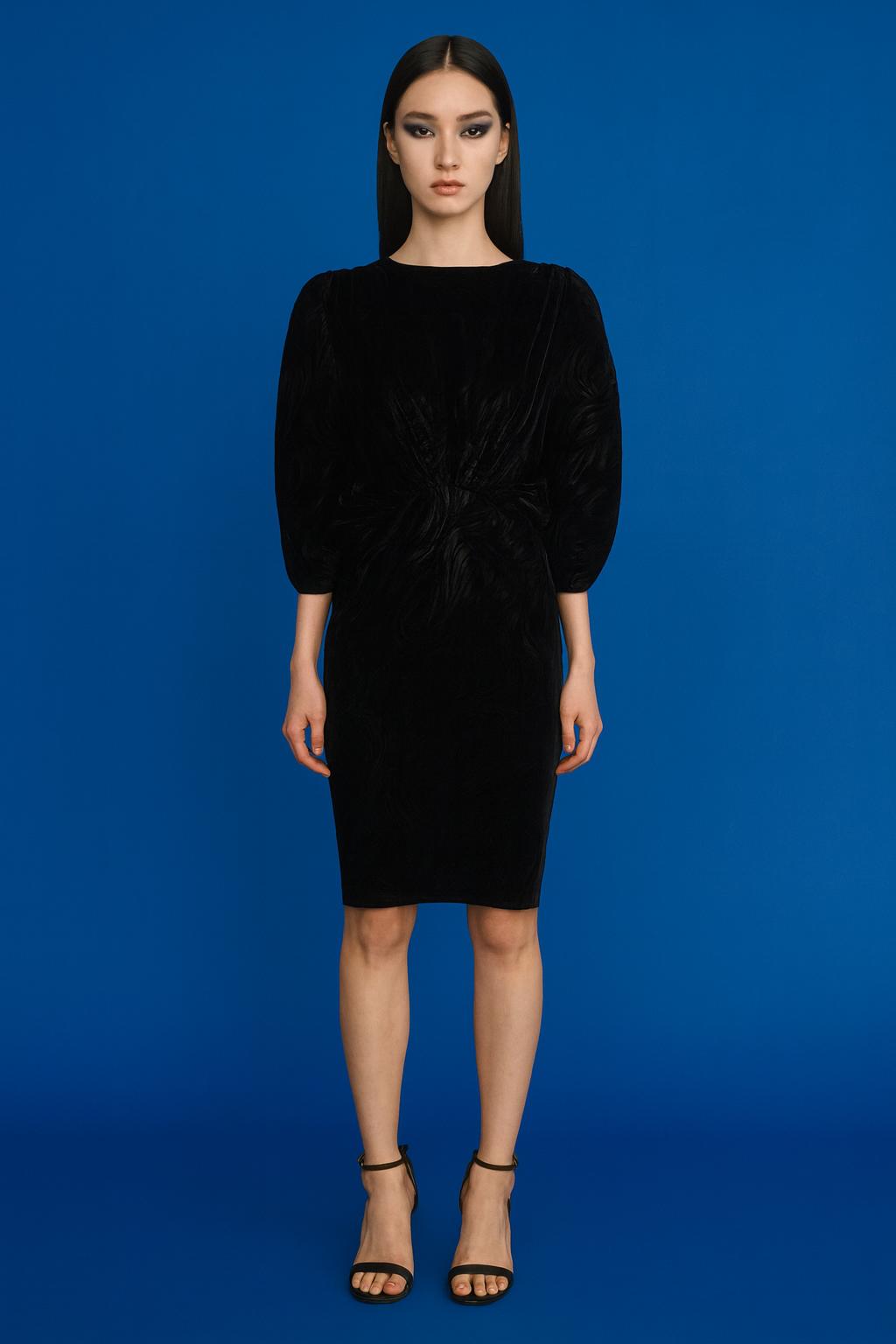 Krátké šaty z vytkávaného materiálu s řasenými rukávy. Šaty mají tříčtvrteční rukávy, délku ke kolenům a skryté zapínání ve švu na zadním díle. Ready-to-wear